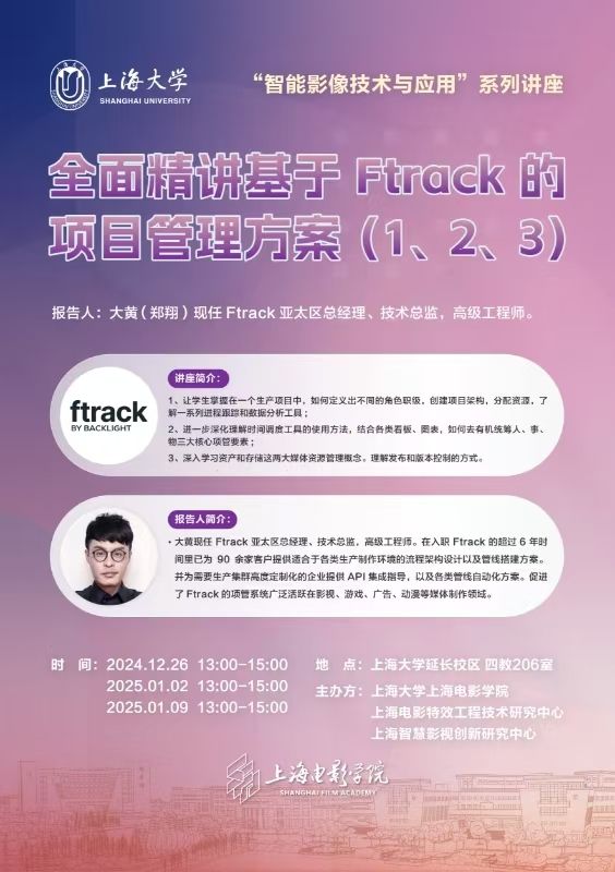 “智能影像技术与应用”系列讲座 题目:全面精讲基于Ftrack项目方案管理实践(一、二、三) 主讲嘉宾:郑翔,Ftrack亚太区总经理、技术总监 郑翔,在影视游戏行业有超过10年的项目经验,曾获得SCRUM项目管理认证,有丰高的项目开发流程架构与项目管理实践经验,曾与好菜坞艺术团队合作,在Foundry在亚太区流程指导。现任瑞典知名项目管理方案提供商Ftrack亚太区总经理、技术总监。 时间: 2024年12月26日13:00-15:00 2025年1月2日13:00-15:00 2025年1月9日13:00-15:00 地点:上海大学延长校区 第四教学楼206室 主讲内容: 三次讲座将针对影视项目管理方法以及Ftrack资产管理工具在影视项目中的应用展开。结合实践,让学生能通过使用Ftrack,实现对项目的便捷、可视及协同管理。 主办单位 上海电影学院 承办单位 上海大学上海电影学院 上海电影特效工程技术研究中心 上海智慧影视创新研究中心 |