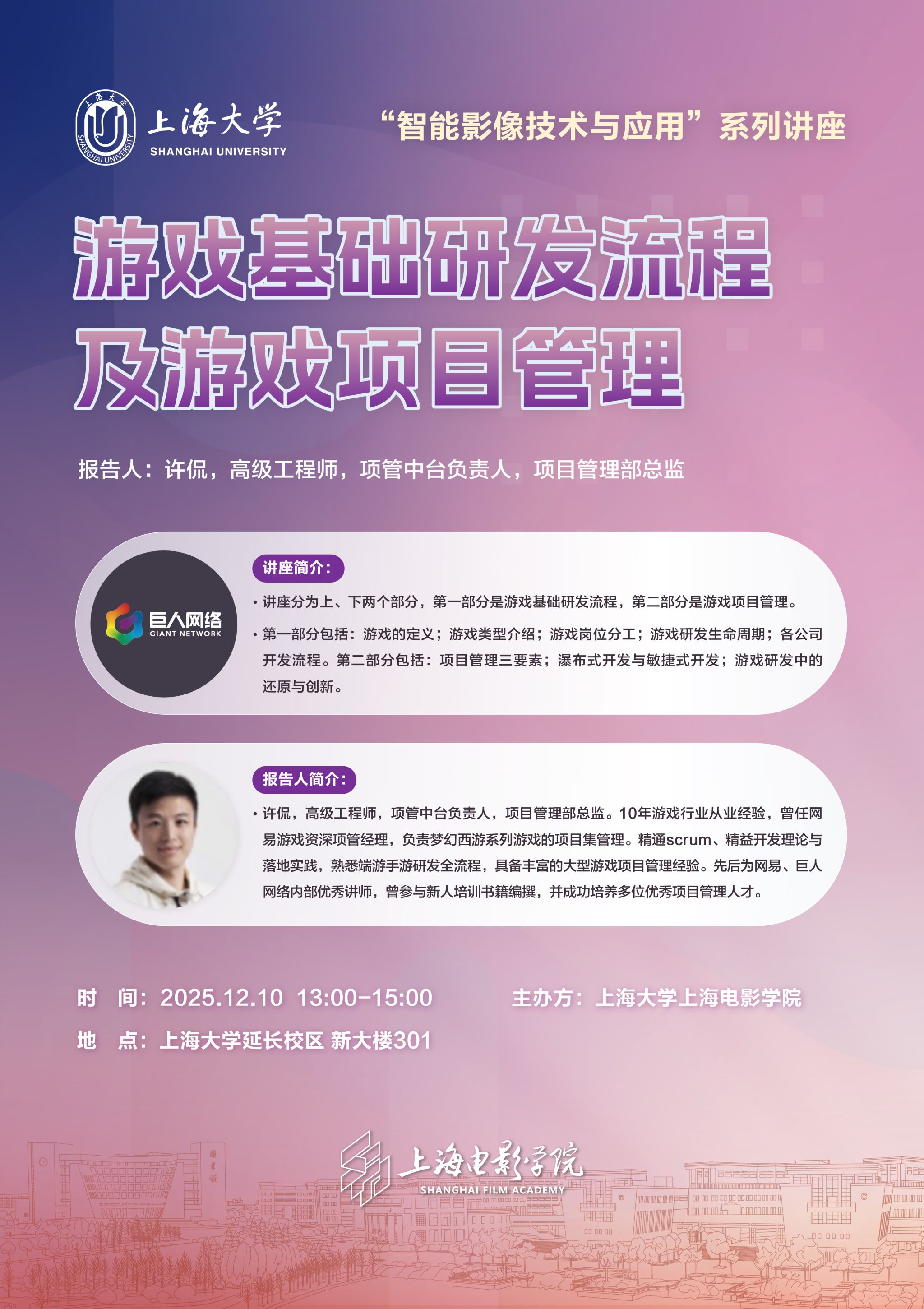 讲座主题:游戏基础研发流程及游戏项目管理 主讲人:许侃 主讲人单位:巨人网络 主讲人介绍: 许侃,高级工程师,项管中台负责人,项目管理部总监。10年游戏行业从业经验,曾任网易游戏资深项管经理,负责梦幻西游系列游戏的项目集管理。精通scrum、精益开发理论与落地实践,熟悉端游手游研发全流程,具备丰富的大型游戏项目管理经验。先后为网易、巨人网络内部优秀讲师,曾参与新人培训书籍编撰,并成功培养多位优秀项目管理人才。 讲座内容简介: 讲座分为上、下两个部分,第一部分是游戏基础研发流程,第二部分是游戏项目管理。 第一部分包括:游戏的定义;游戏类型介绍;游戏岗位分工;游戏研发生命周期;各公司开发流程。第二部分包括:项目管理三要素;瀑布式开发与敏捷式开发;游戏研发中的还原与创新。 讲座时间:2025-12-10 13:00-15:00 讲座地点:上海市上海大学延长校区新大楼301 |