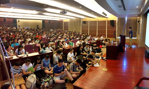 开班仪式现场 7月4日上午,2016年"未来杯"上海市高中阶段学生微电影大赛·微电影拍摄制作体验营开营仪式在上海大学宝山校区乐乎新楼学海厅隆重举行。"未来杯"上海市高中阶段学生微电影大赛由共青团上海市委员会、上海市教育委员会、上海大学、上海学生联合会主办,由上海电影学院、共青团上海大学委员会、上海大学学生会联合承办。团市委学校工作部副部长、市学联副秘书长任浡老师,上海大学上海电影学院党委副书记孙琦琰老师,上海大学团委副书记陈中元老师出席了开营仪式。